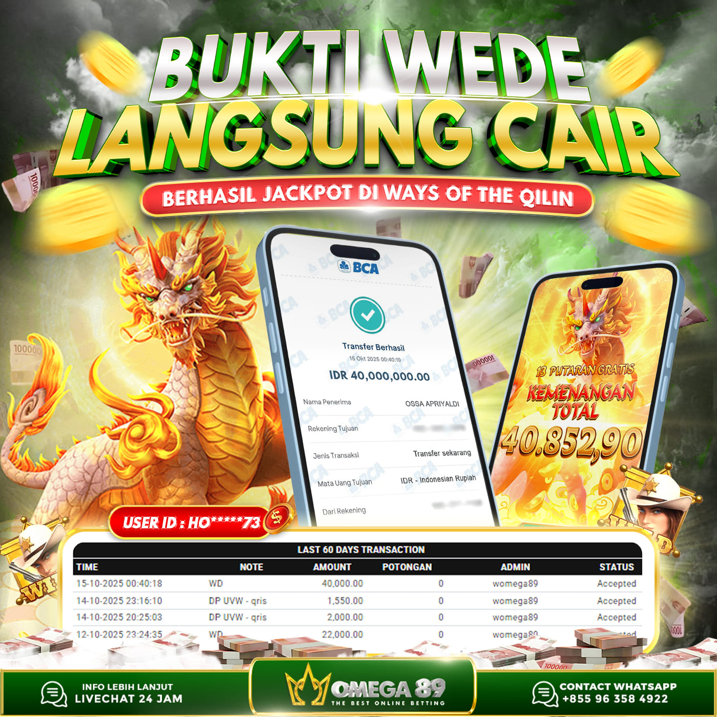 Selamat untuk Member OMEGA89 dengan User ID : HO*****73 Telah berhasil memenangkan jackpot besar dalam permainan slot WAYS OF THE QILIN sebesar Rp.40.000.000, Lalu setelah melakukan pengisian formulir untuk melakukan withdraw dengan jeda waktu 3–5 menit pihak Customer Service Omega89 akan melakukan proses transfer ke rekening pribadi milik User ID tersebut dan dana yang sudah di withdraw bisa langsung di cairkan oleh pemenang jackpot. Bukti transfer atau pembayaran yang di berikan pihak Omega89 adalah bentuk bukti pembayaran yang VALID/SAH karena langsung dari bank tujuan yang digunakan.